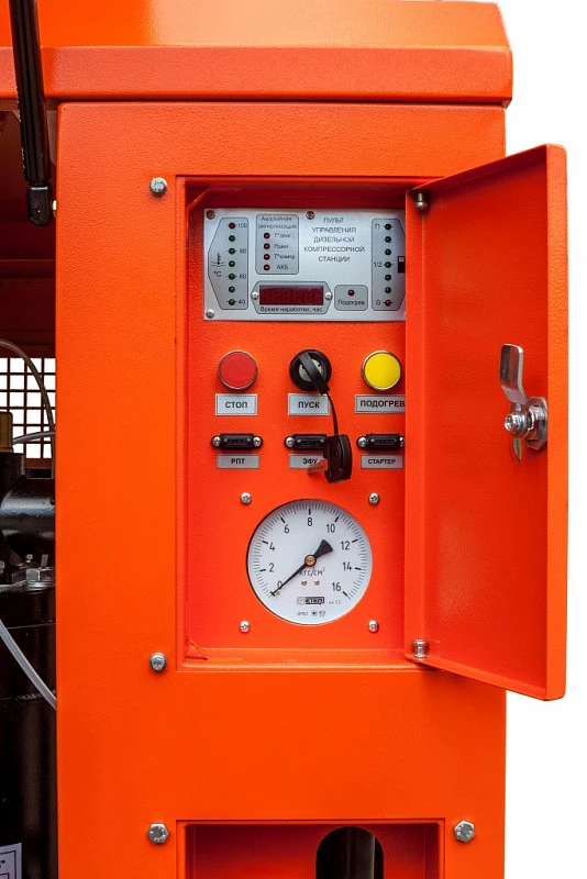 Система управления • Ударопрочный приборный щит, рассчитаный на работу при экстремально низких и высоких температурах, в условиях резких перепадах и повышенной влажности. • Интуитивно понятные средства управления и индикации. • Датчики аварийной защиты: 1 – минимального давления масла дизеля, 2 – перегрева дизеля, 3 – перегрева компрессора • Указатель уровня топлива, контрольная лампа заряда АКБ, кнопка предпускового подогрева, манометр давления. • Защита электрических цепей предохранителями. |
