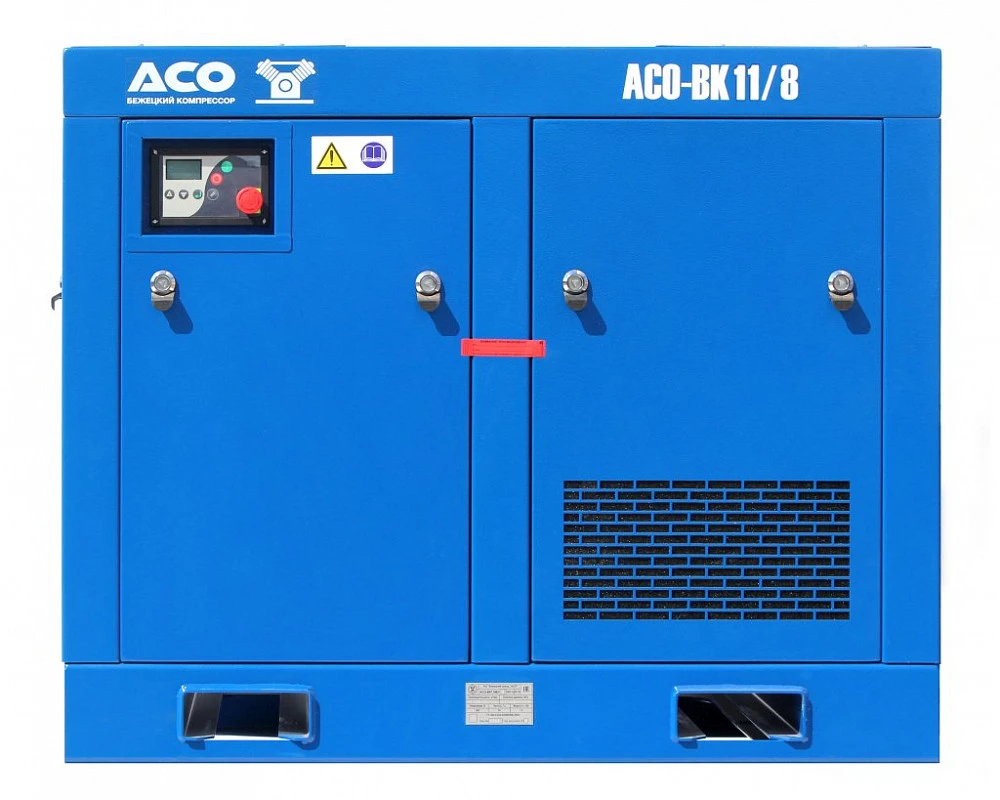 Стационарный винтовой компрессор АСО-ВК-11/8М2 имеет производительность 1700 л/мин и рабочее давление 8 атм. Двигатель 11 кВт / 380 В, винтовой блок с ременным приводом. Температура эксплуатации от 5 до 40 °С. Уровень шума не превышает 80 дБа. Габариты 109 х 79 х 87 см., масса 305 кг.