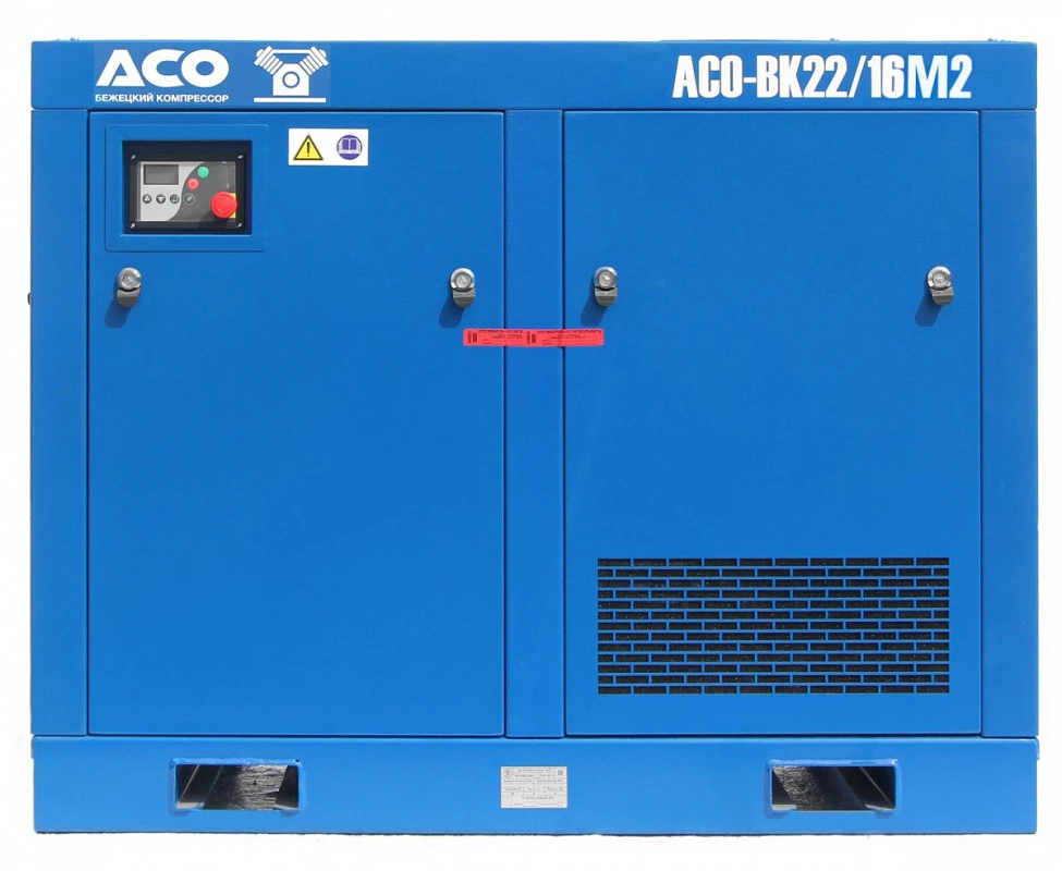 Винтовой компрессор АСО-ВК22/16М2 производства Бежецкого завода АСО оснащен ременным приводом и имеет производительность по нагнетанию 1,8 м3/мин, рабочее давление 16 атм. Электродвигатель мощностью 22 кВт. Рабочий диапазон температур от 5 до 40°С, расход масла на унос не более 1 г/час. Уровень шума не более 80 дБа. Габариты установки составляют 125 х 110 х 135 см., масса 620 кг.