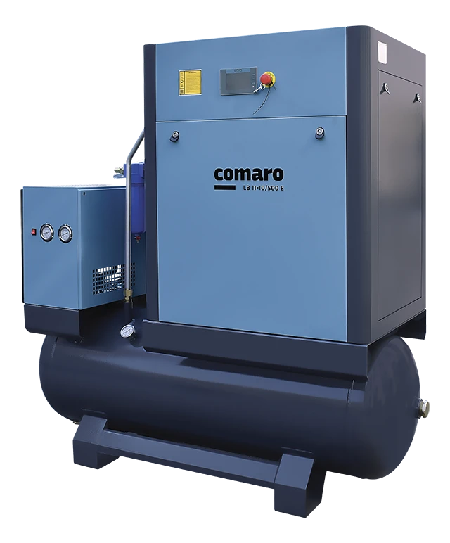 Серия COMARO LB E – это компрессоры с осушителем воздуха и двумя линейными фильтрами – высокоэффективная компрессорная станция.