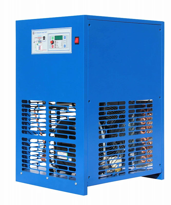 Работа осушителя осуществляется за счет конденсации влаги на холодной поверхности. Контур теплообменника «Воздух-воздух» охлаждает горячий воздух. Второй контур теплообменника «Воздух-фреон» понижает температуру сжатого воздуха до установленной температуры точки росы. Пары воды конденсируются и впоследствии отделяются из воздуха. Полученный конденсат собирается в сепараторе и удаляется через блок слива конденсата. Компрессор обеспечивает циркуляцию хладагента по фреоновому контуру осушителя.