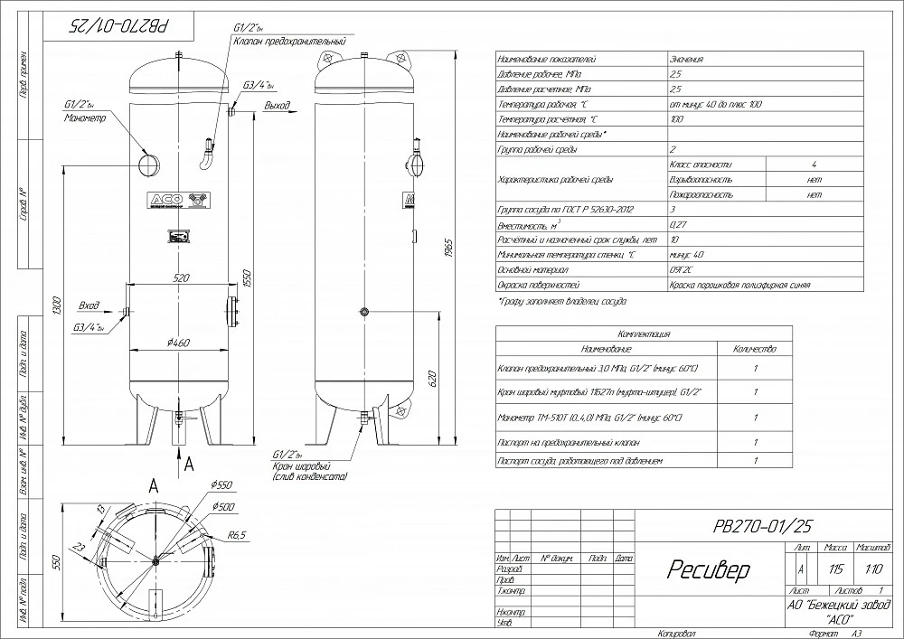 Комплектация воздушного ресивера РВ 270-01/25: