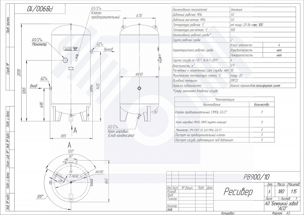 Конструкция нового воздушного ресивера РВ 900/10 разработана ведущими специалистами АСО, за плечами которых, громадный опыт в проектировании сосудов работающих под избыточным давлением.